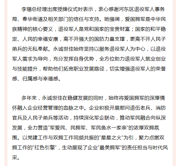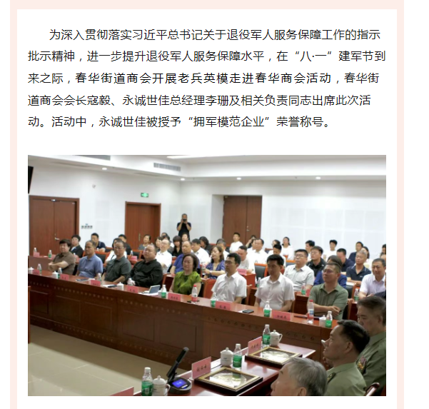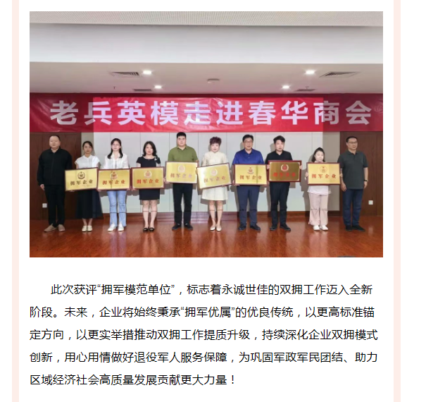 永誠世佳被授予“擁軍模范企業(yè)”榮譽(yù)稱號(hào)